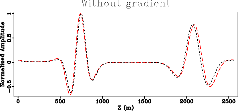 term in the phase function, also after normalization. After including the velocity-gradient term, the error decreases significantly, and is caused mainly by small amplitude differences. On the other hand, the difference calculated without using the velocity-gradient term is due mostly to the shift in phase. This observation is further supported by Figure 7, which shows a comparison between traces extracted from the 2D wavefield snapshots at