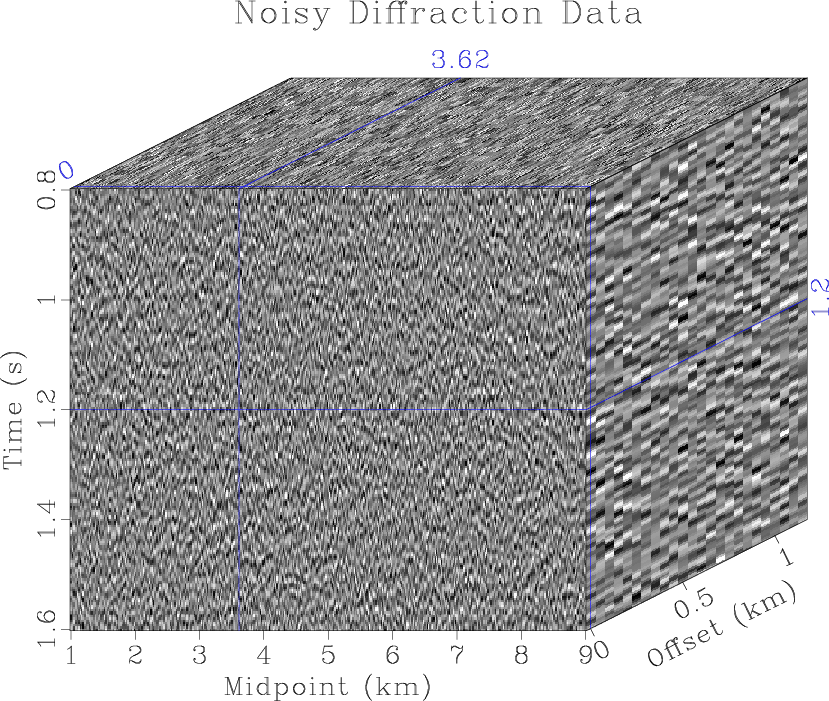 The noisy deterministic image, Figure 13b, contains significantly more noise than its noiseless counterpart, Figure 9b. Although some of the strongest diffractions seen in the ideal image, Figure 13a can be seen in the deterministic image, it can be difficult to tell which objects are diffractions and which are noise without the ideal image as reference. The corresponding deterministic gather, Figure 14b is also noisy when compared to the ideal gather, Figure 14a. As was the case with the deterministic image, although most of the planar diffraction events from the ideal gather can be seen in the deterministic gather and identified because of their lateral coherence, their amplitudes are typically not much stronger than those of background noise.