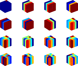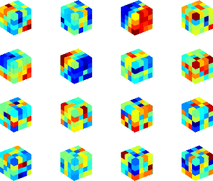 Figure 3. (a) Initial overcomplete DCT dictionary. (b) Learned dictionary using K-SVD. (c) Learned dictionary using SGK. Only the first 16 atoms in the dictionary are displayed and each dictionary has been reshaped into a 3D cube. It can see from (a) that the shapes of the atoms in the initial dictionary (discrete cosine transform) are rigid, which are not optimal to represent the highly-nonstationary seismic data. After dictionary learning, the updated dictionaries as shown in (b) and (c) contain atoms with much varied shapes. These various atoms are more likely to capture the non-stationary features hidden in the seismic data. |