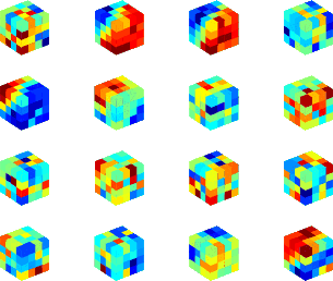 2) corresponding to K-SVD and SGK methods, respectively. It can be observed that there are some non-zero amplified similarity values around the events, indicating these tiny damages to the signal caused by both methods. It can also be observed that the amplified local similarity of SGK method is slightly higher than K-SVD method. Considering the slightly low SNR using SGK method, I conclude that SGK method might cause slightly worse performance than the K-SVD method while obtaining a huge improvement on computational efficiency. I also show some learned atoms of this example in Figure 3. Figures 3a, 3b, and 3c show the atoms from initial dictionary, K-SVD learned dictionary, and SGK learned dictionary, respectively. I set up the initial dictionary using the discrete cosine transform. It can be seen from Figure 3a that the shapes of the atoms in the initial dictionary are rigid, which are not optimal to represent the highly-nonstationary seismic data. After dictionary learning, the updated dictionaries as shown in Figures 3b and 3c contain atoms with much varied shapes. These various atoms are more likely to capture the non-stationary features in the seismic data and thus can potentially improve the sparse representation of the observed noisy seismic data. Please note that each atom has been reshaped into a 3D cube and only 16 atoms are shown here.