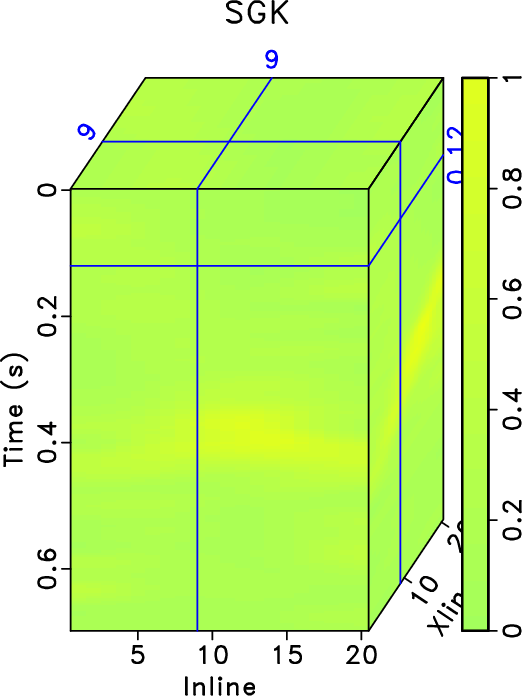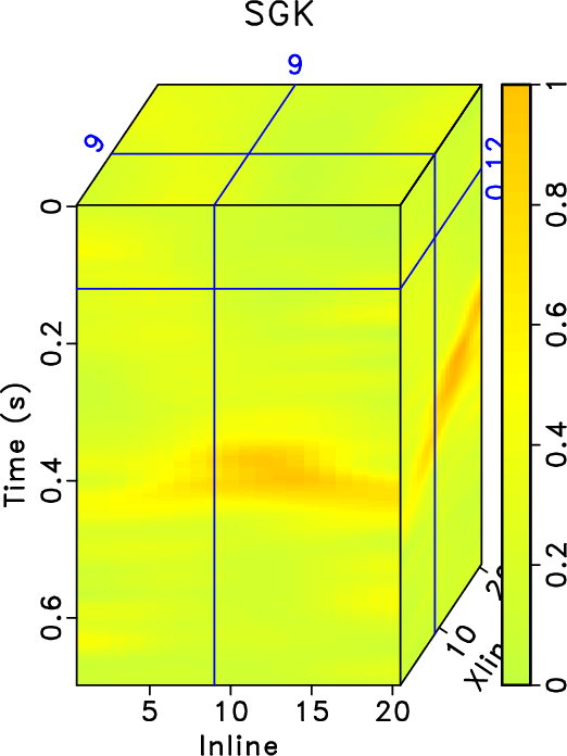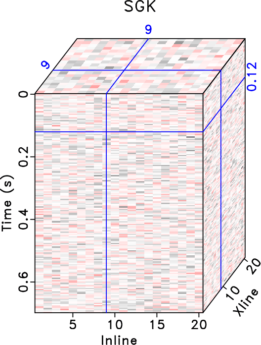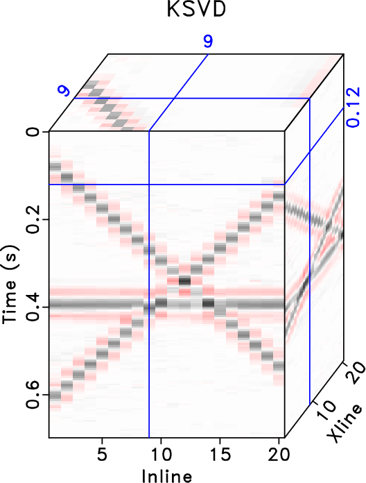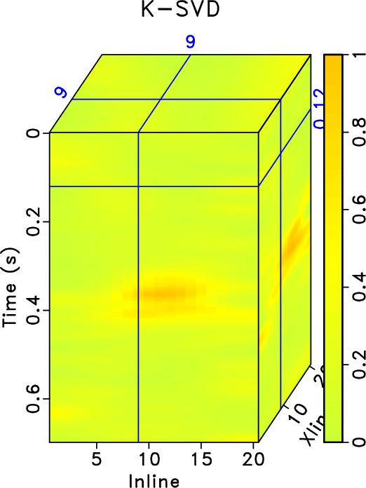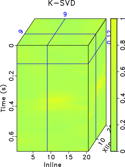 . The K-SVD takes 192.60s while SGK takes only 9.27s. The SNRs of noisy data, K-SVD result and SGK result are 0.68 dB, 9.61dB and 9.32dB respectively. While the SNRs using the K-SVD and SGK are very similar, the SGK method obtains about 5 times acceleration. To further demonstrate the denoising performance and compare the two methods regarding the tiny differences, I plot the local similarity between denoised data and removed noise in Figure 2. Figures 2a and 2b show the local similarity cubes without amplification that correspond to K-SVD and SGK methods, respectively. It can be seen that both methods cause negligible local similarity, or correlation, between denoised data and removed noise, confirming the extremely successful performance of the two methods. Figures 2c and 2d show the amplified local similarity cubes (similarity