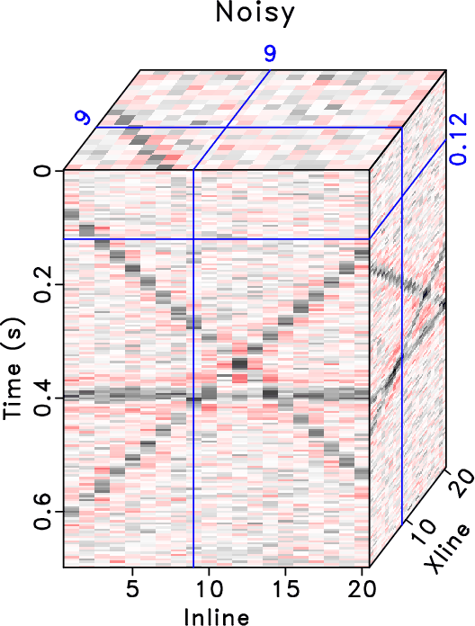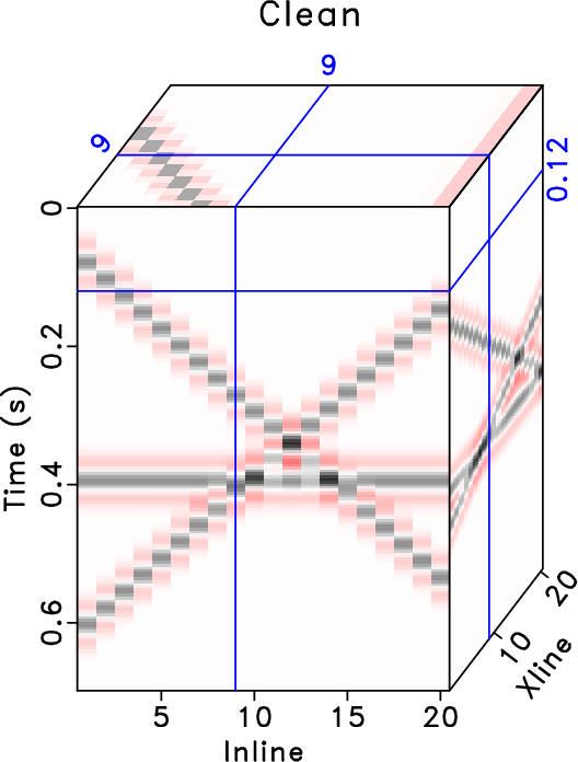 Figure 1. 3D synthetic example. (a) Clean data. (b) Denoised data using K-SVD. (c) Denoised data using SGK. (d) Noisy data. (e) Noise using K-SVD. (f) Noise using SGK. |