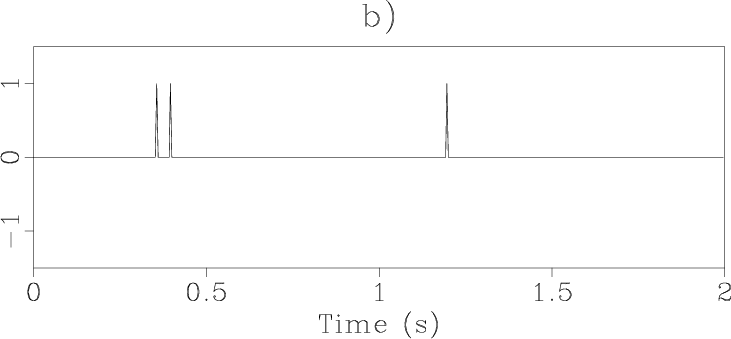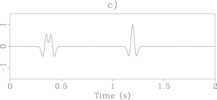 Figure 1. (a) Zero-phase Ricker wavelet. (b) Reflection coefficient. (c) Noisy signal with ![]() ![]() |