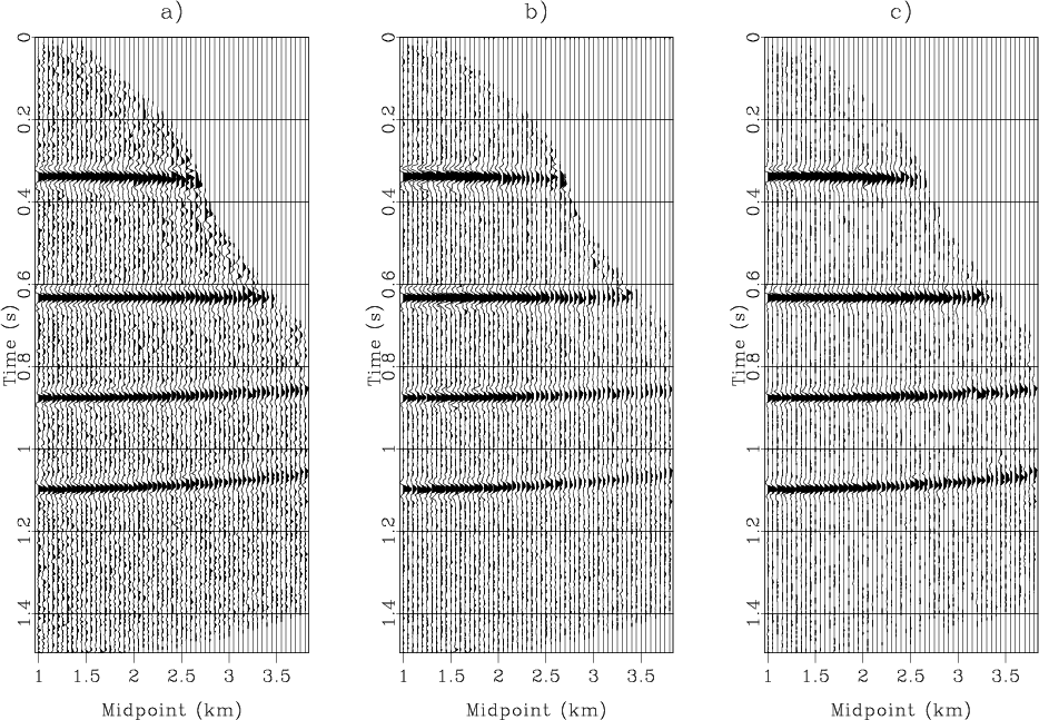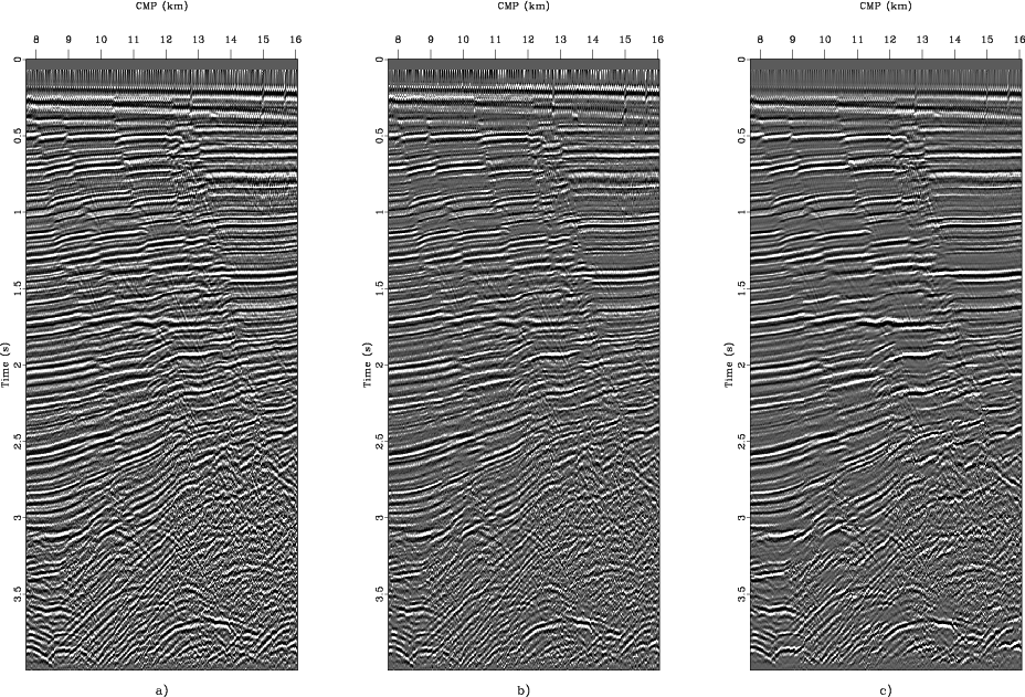 Figure 5. Results of (a) conventional equal-weight stacking (S/N=27.4), (b) LMO-based weighted stacking (S/N=29.2) and (c) local-correlation weighted stacking (S/N=33.9). |