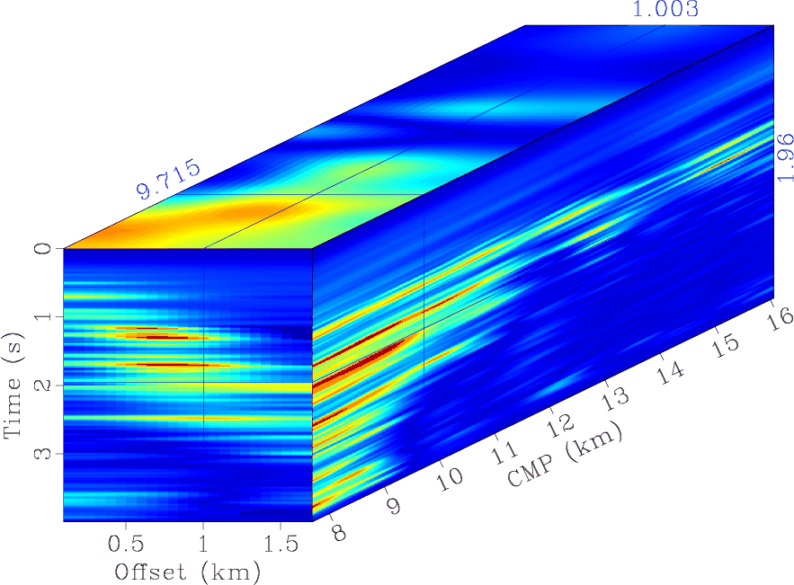 Comparing the three methods, one can find that smart stacking and LMO-based weighted stacking can remove upside wing distortion cleanly, but stacking using local correlation removes more random noise than the other two methods and meanwhile corrects upside wing distortion.