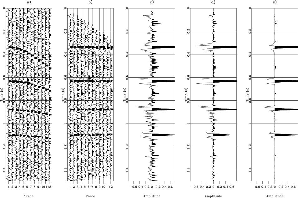 Figure 3. (a) One CMP gather from synthetic data set. (b) NMO-corrected gather. (c) Result of conventional equal-weight stacking. (d) Result of LMO-based weighted stacking. (e) Result of local-correlation weighted stacking. |