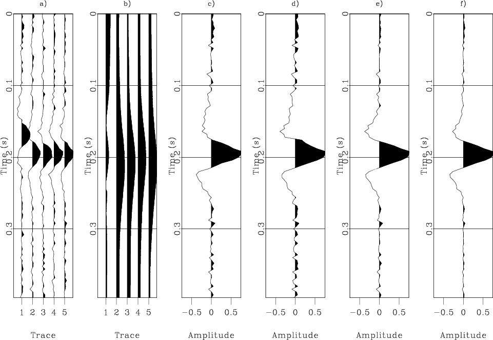 Figure 2d and Figure 2e illustrates results of smart stacking (Rashed, 2008) and LMO-based weighted stacking in which the weights are computed by the LMO method (Neelamani et al., 2006; Robinson, 1970). Figure 2f shows the result of stacking using local correlation with weights (Figure 2b) determined by the similarity between the prestack trace (Figure 2a) and the reference (Figure 2c). Because the waveform in the first trace in Figure 2a is most likely noise or artifact, it is reasonable that the weight in the stack procedure is lower. Use of local correlation as weights of prestack traces lets us select those portions, which are more similar to the reference trace to contribute to the stack.