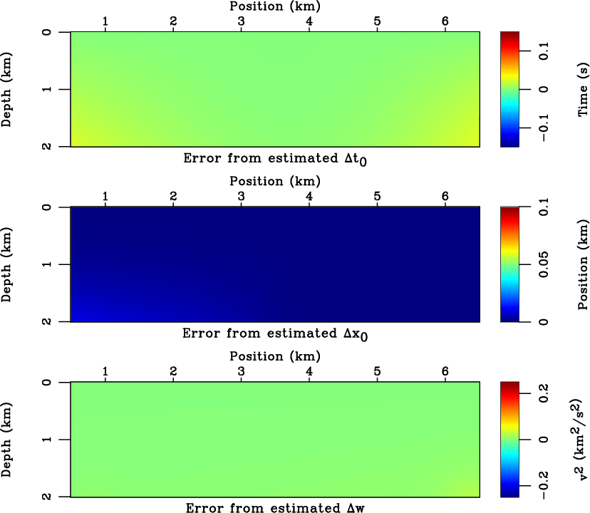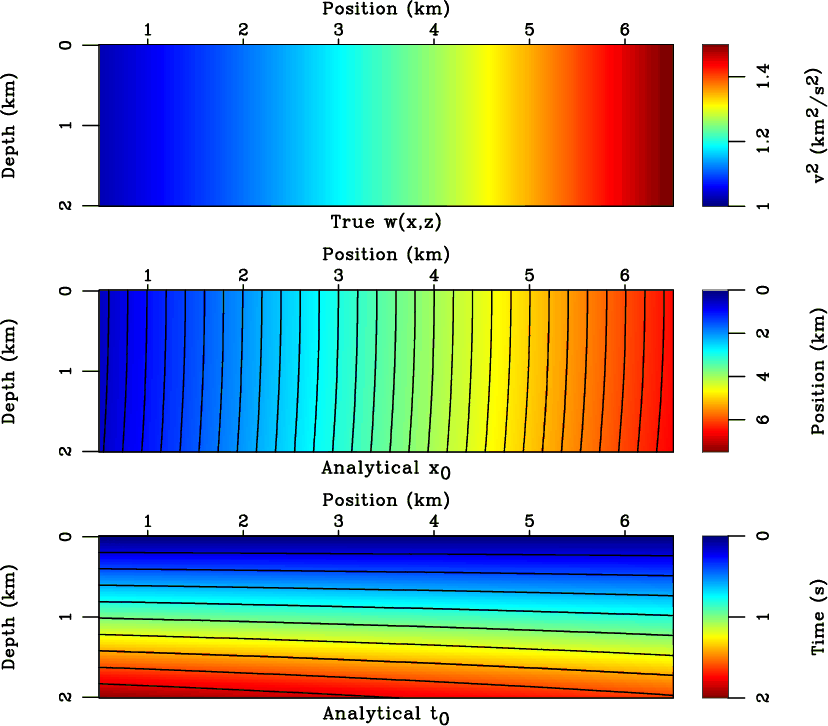 lateral extent of the model. The analytical solutions to time-to-depth conversion in this particular type of model were presented by Li and Fomel (2015). Figure 3 shows the true interval velocity of the model (equation 22), and the analytical