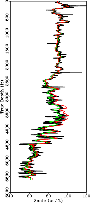 Figure 15. (a) Estimated sonic log using the proposed approach after Backus averaging (green). Updated sonic log after four iterations of matching using LSIM to estimate shifts (red). Estimated sonic log after interpolation of missing data (black). (b) TDR from estimated sonic log (green). Updated TDR after four iterations of matching using LSIM to estimate shifts (red). |