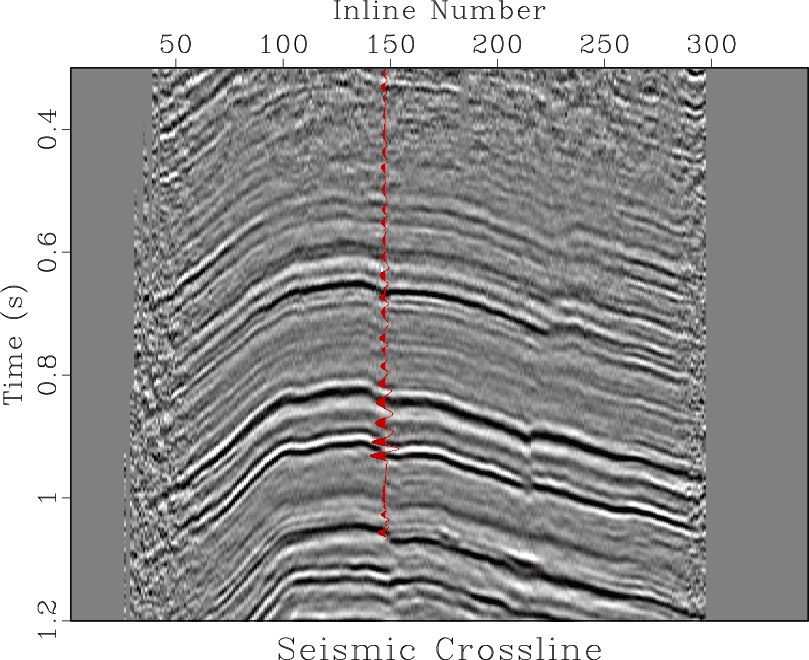 Figure 16. Seismic crossline through well in Figures 14 and 15. We observe a good tie between the modeled synthetic and real seismic data. The sonic and density logs used to model the synthetic are estimated using the proposed approach. |