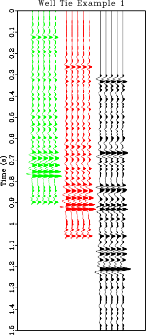 Figure 14. Synthetic modeled using the initial sonic log (green). Synthetic modeled using the sonic log updated after four iterations of matching using LSIM to estimate shifts (red). Closest trace to the well location extracted from the phase adjusted seismic data (black). |