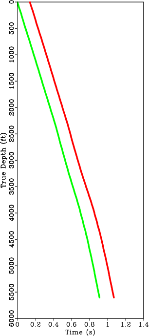 The initial Backus averaged sonic, updated sonic, and original sonic logs are shown in Figure 15a. We observe that the majority of adjustments to the sonic log occurs between 3500 and 3900 feet. This adjustment can also be observed by comparing the initial and updated TDR's in Figure 15b. The differences between synthetic seismograms modeled from well log data and seismic data are usually attributed to either inaccuracies in the seismic phase or seismic migration velocities (White, 1998; Henry, 2000). The bulk shift between initial and final TDR is related to missing shallow velocity section in the well log. The results in Figure 15 provide an initial qualitative assessment of a seismic well tie to ensure the estimated shifts do not result in an improbable update to the sonic log. We overlay the modeled and tied synthetic seismogram with the crossline that cuts through the well and observe a reasonable tie with the seismic data, even in the presence of a fault (Figure 16).
