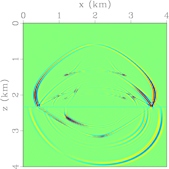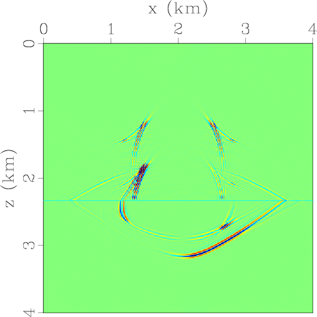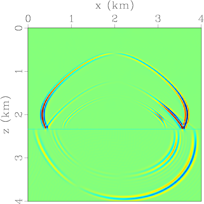 Figure 1. Horizontal and vertical components of the elastic wavefields at the time of 0.3 s synthesized by solving the 2nd-order elastic wave equation with |