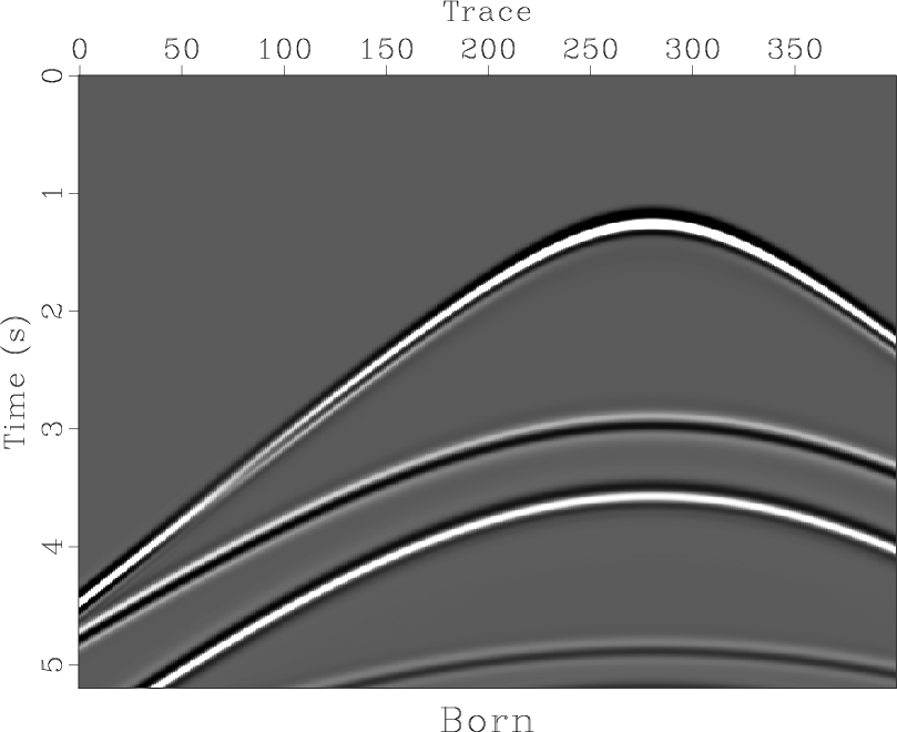deriv = 1 csq = ../csq_4layer.rsf csq_d1 = ../dcsq_4layer.rsf source = ../wavelet12000.su data = ../born12000.suThe linearized response (Born modeling) corresponding to Figure 6 appears as Figure 9.