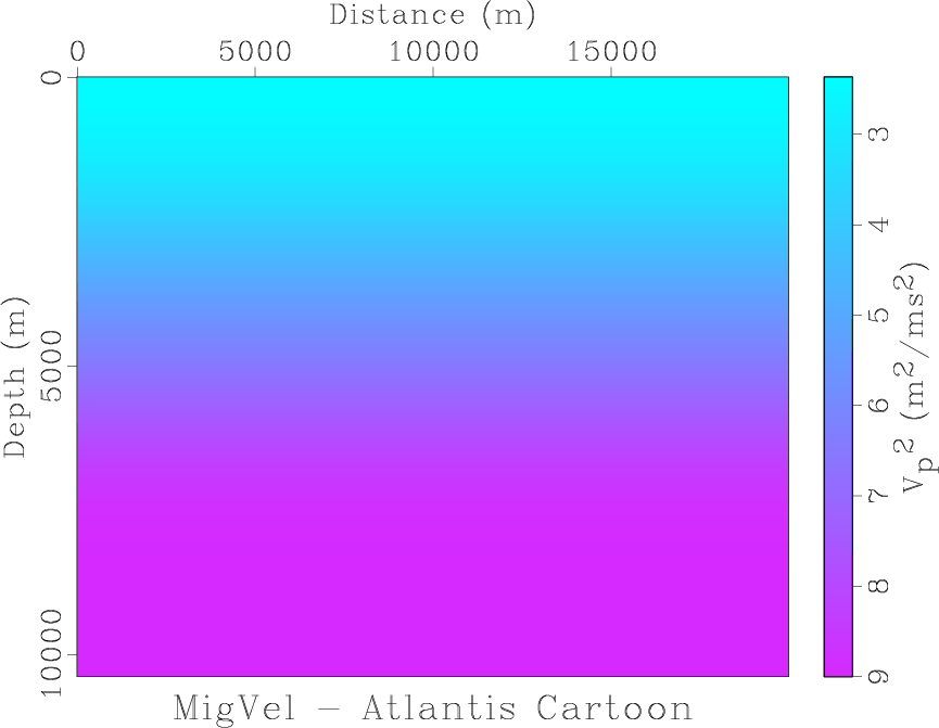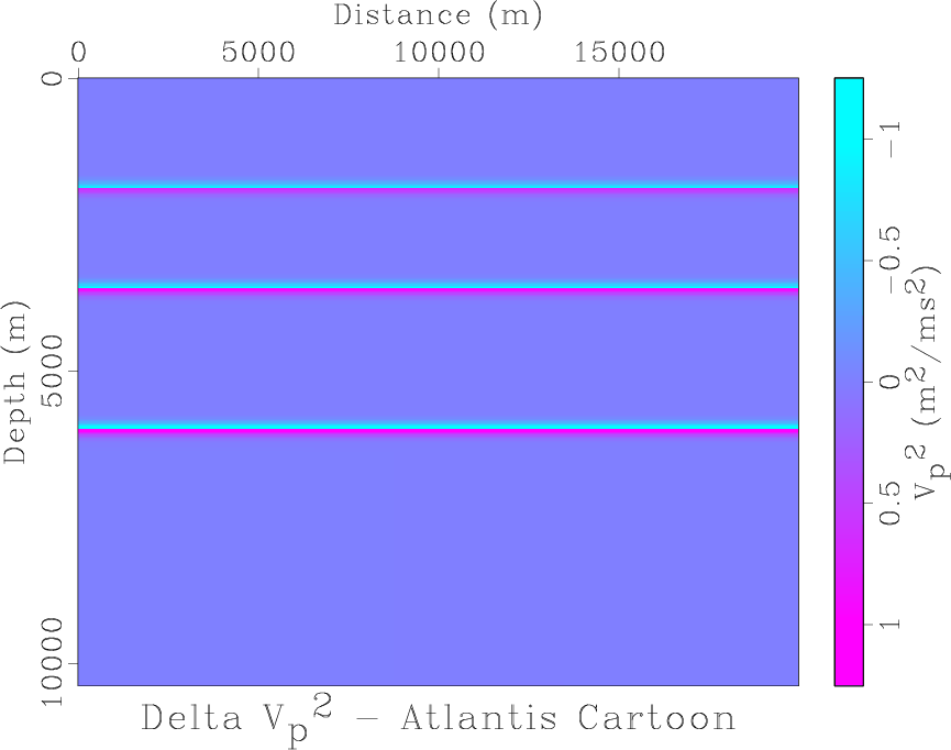 For the acoustic constant density application, Born approximation requires reference and perturbation square velocity fields. Figures 7 and 8 show perturbation and reference square velocity fields, respectively, that will generate Born data roughly corresponding to the preceding example. The required parameters are