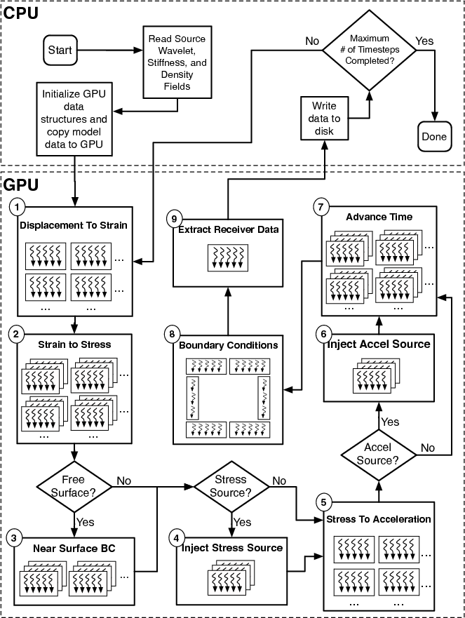 ); 7) Compute the forward time step from current and previous wavefield values; 8) Apply boundary conditions through cascade of ABC and sponge operators; and 9) Output data/wavefield as required. The next section details our GPU implementation of these steps.