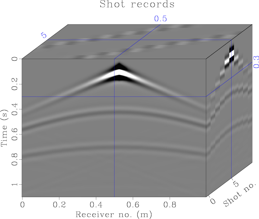We obtain the velocity model in Figure 1 and the shot gathers in Figure 2. To have a look at the movie by looping over each shot gather, run scons.