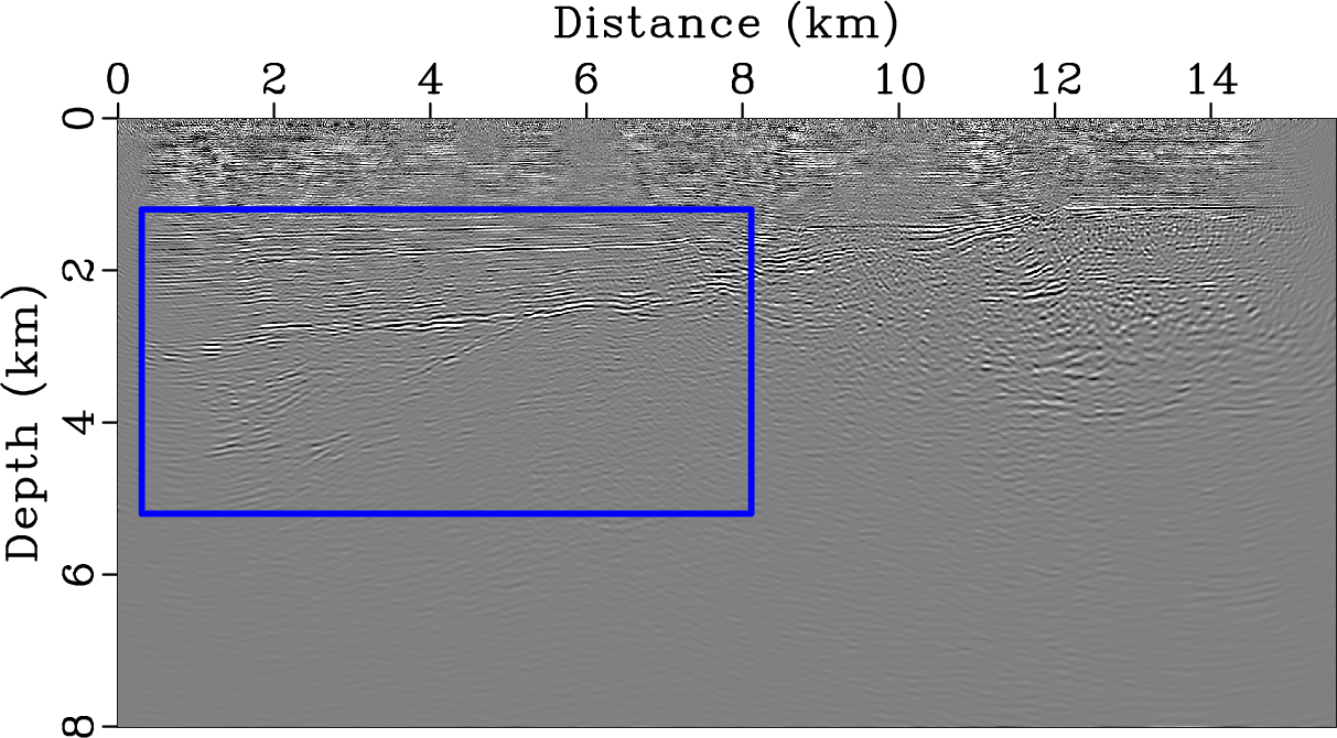 -RTM from real data (Figure 10b), respectively. For a clearer comparison, we display the zoomed in seismic images in Figure 11 corresponding to the marked area from Figure 10. From Figures 10a and 10b, one can conclude that the