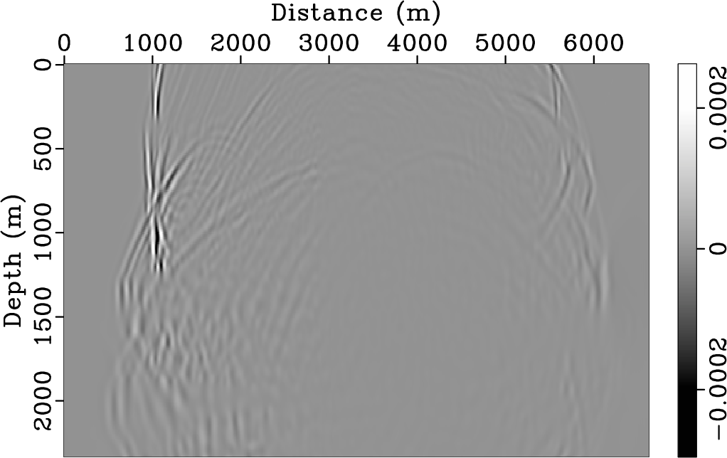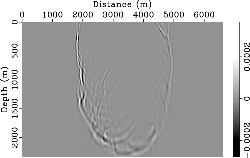 As this chapter mainly focuses on -RTM and its GPU implementation, we do not pay much attention to the numerical simulation of spatially varying fractional power of Laplacian operators. There are effective proposed schemes to handle spatial variable-order fractional Laplacians (Wang et al., 2018c; Sun et al., 2014; Chen et al., 2016; Li et al., 2016; Wang et al., 2018a). Chen et al. (2016) proposed two efficient methods to calculate spatial variable-order fractional Laplacians, i.e., Taylor-expansion approximation scheme and Low-rank decomposition scheme. Wang et al. (2018a) extended the Taylor-expansion approximation scheme to the viscoelastic case. All of these methods come at the expense of computational efficiency. In this code package, the averaged strategy (Zhu et al., 2014) is used to achieve a quick solution. Improving the accuracy of the code package will be my future work.