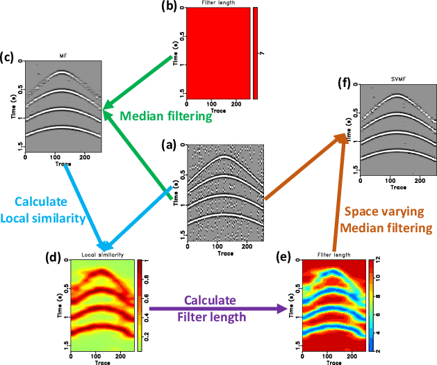 To facilitate an easier understanding of the space-varying median filtering, more specifically the relation among initially filtered data, local similarity, variable filter length, we draw an illustrative picture shown in Figure 5. Figure 5(a) denotes the noisy data. Figure 5(b) shows the map of constant filter length. Figures 5(a) and 5(b) are used to generate the initially filtered data shown in 5(c). Using equation 5, from the original data and the initially filtered data, we can calculate the local similarity map. Utilizing equation 6, we can calculated the map of variable filter length. With the map of variable filter length, we can obtain the finally filtered data shown in Figure 5(f). From this illustration, it is clear that the local similarity clearly detect the main distribution of the useful reflection energy. Those areas with better signal preservation after the initial median filtering are revealed by higher local similarity. The map of variable filter length clearly shows that those noise areas are dealt with very longer filter length while those signal areas correspond to relatively shorter (safer) filter length.