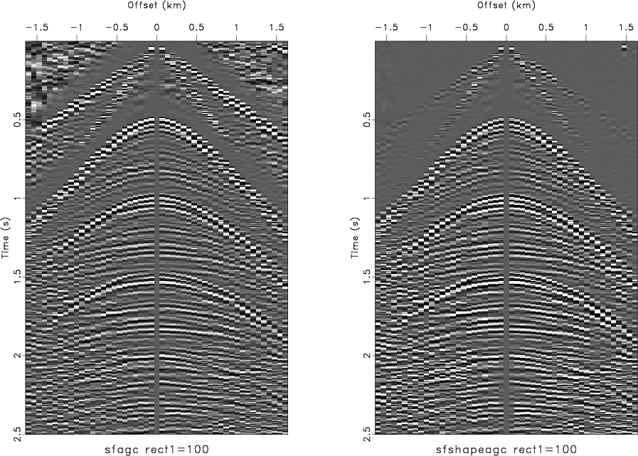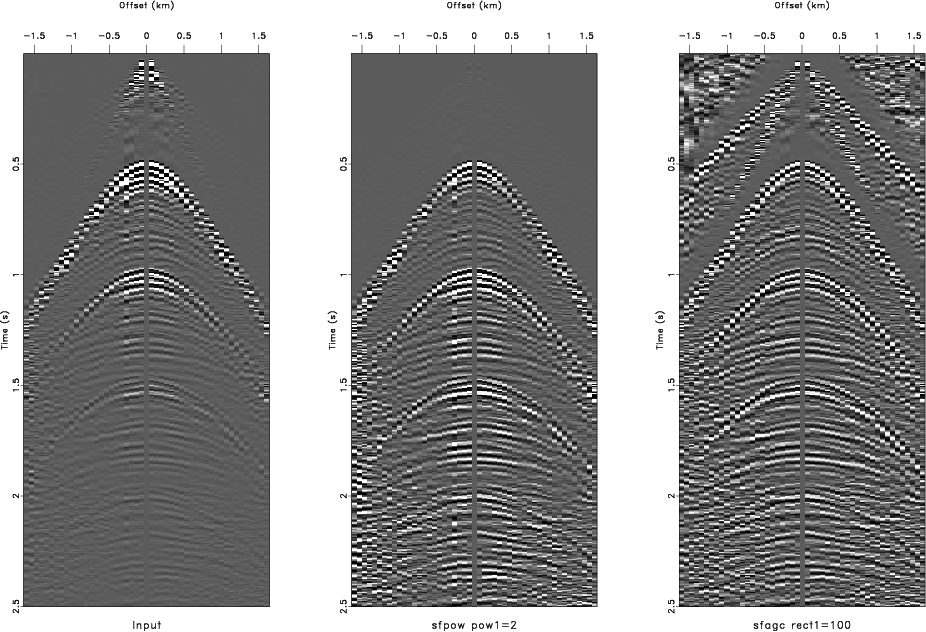 The following example from rsf/rsf/sfagc illustrates the application of sfagc in comparison with the application of sfpow, which applies a gain based on a power of time. The gains are applied to a shot gather from Alaska from the collection of shot gathers by Yilmaz and Cumro. A similar example appears on page 236 in Jon Claerbout’s Imaging the Earth’s Interior.